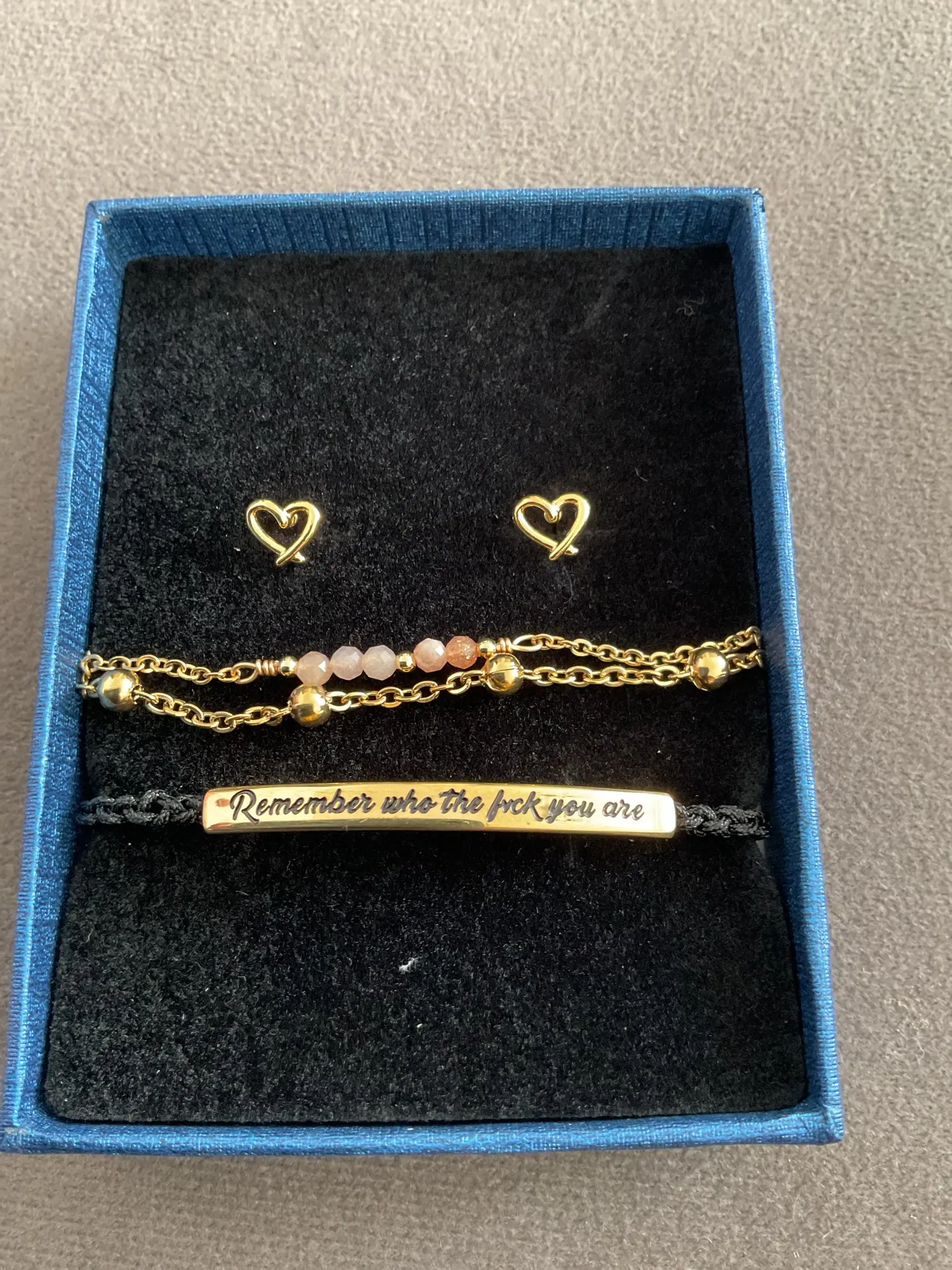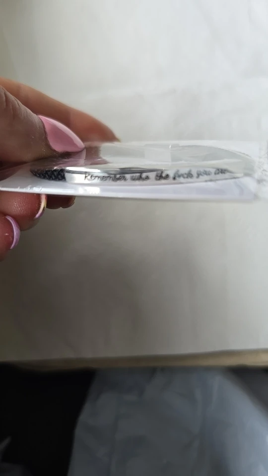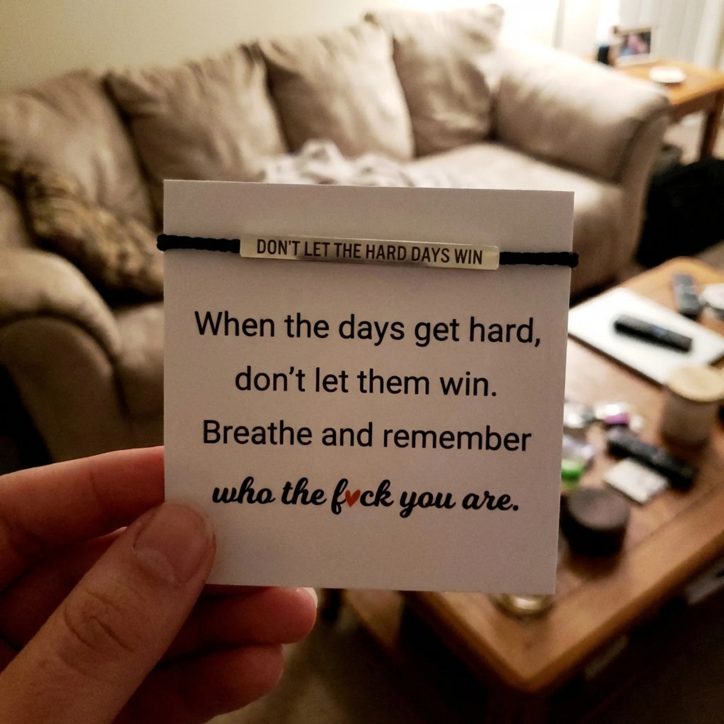 I bought this for my daughter. The bracelet says don't let the hard days win but the card in the packaging says "remember who the f you are" i was not expecting that LOL!